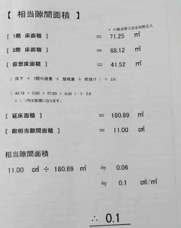 0.06㎝2/m2だったので繰り上げて0.1㎝2/m2となりました。パッシブハウスといわれる0.2㎝2/m2を十分上回っていました。